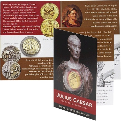 REPRODUCTION Roman coin, Julius Caesar Denarius in information pack [SRCP1P]