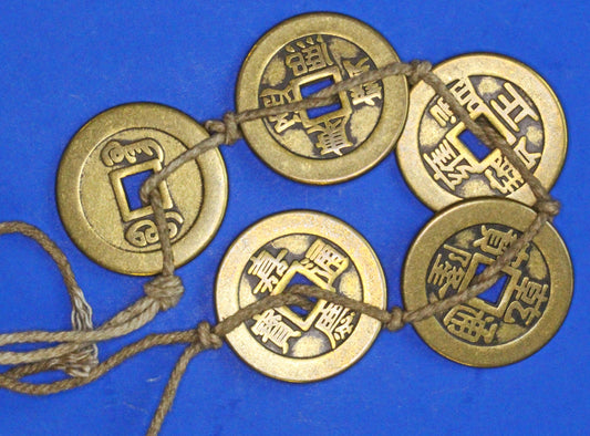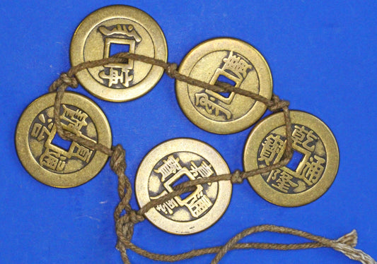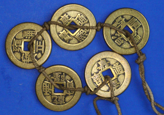 A string of 5 Vintage Brass Chinese Cash Coins, Various Emperors, 25mm [12/25 33904]