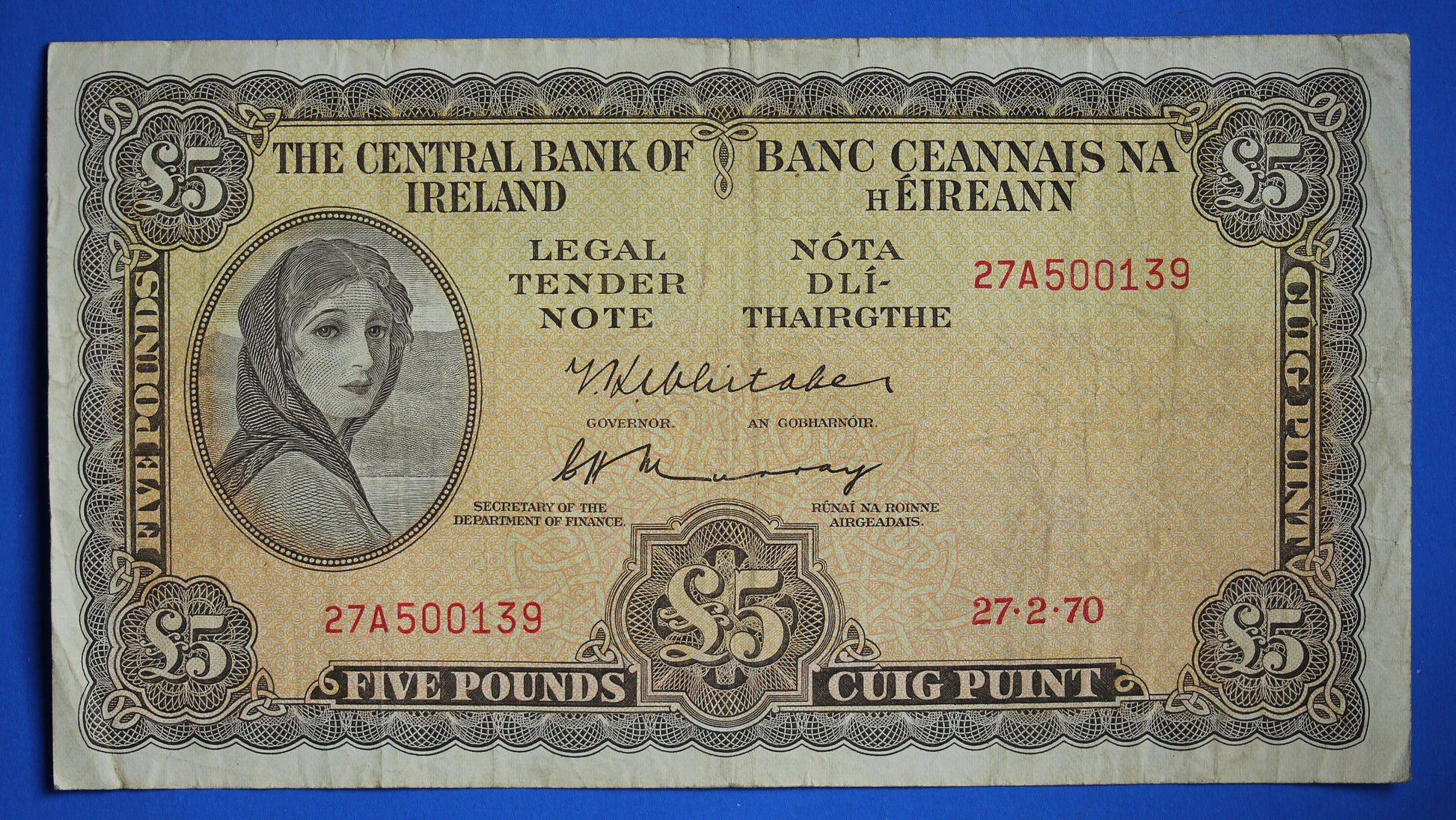 1970 Central Bank of Ireland, Five Pound, Five Punt Irish EIRE Lady Lavery banknote [R09/24 28390]