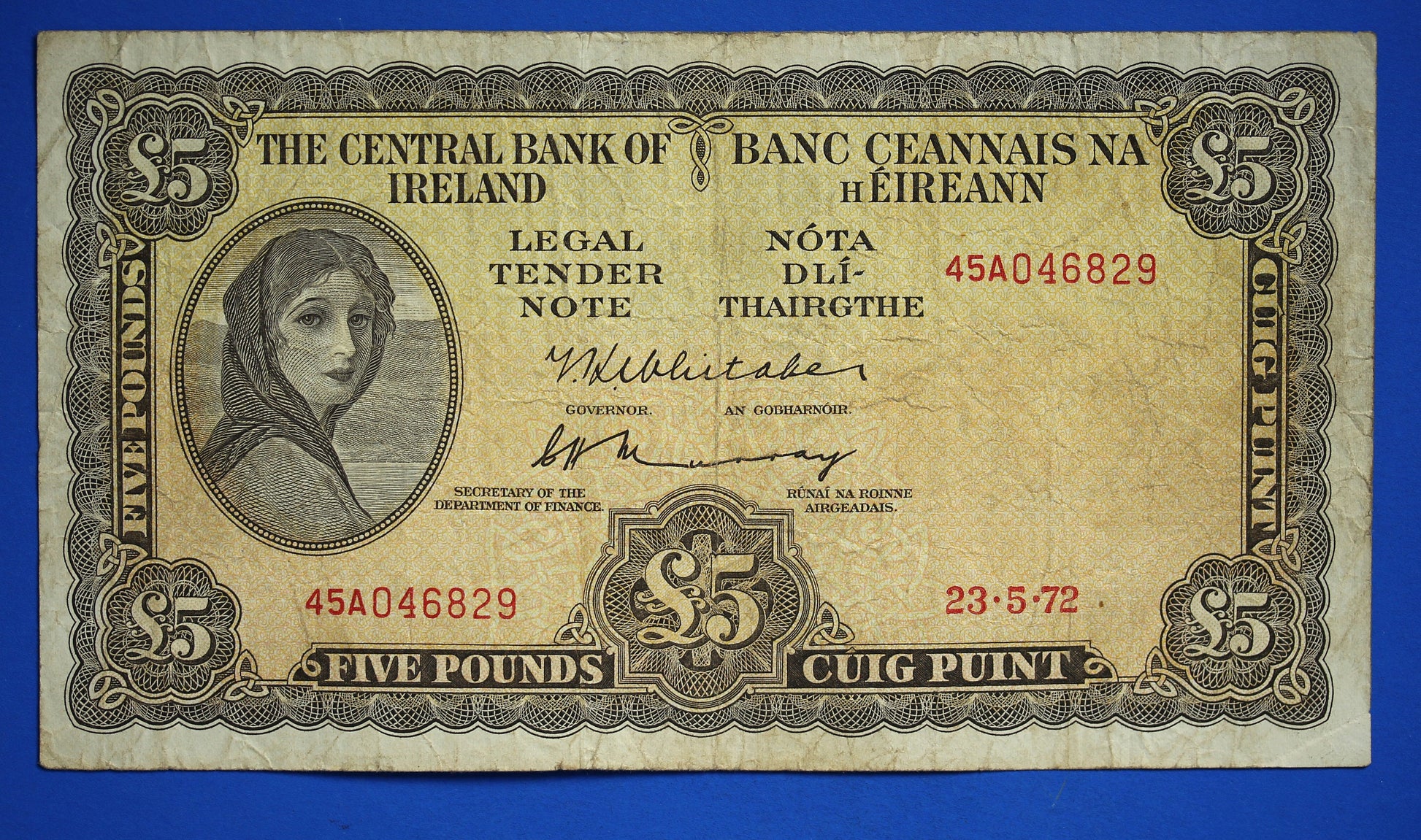 1972 Central Bank of Ireland, Five 5 Pound, Five 5 Punt Irish EIRE Lady Lavery banknote [07/24 30598]