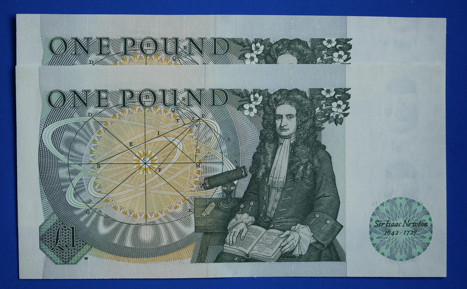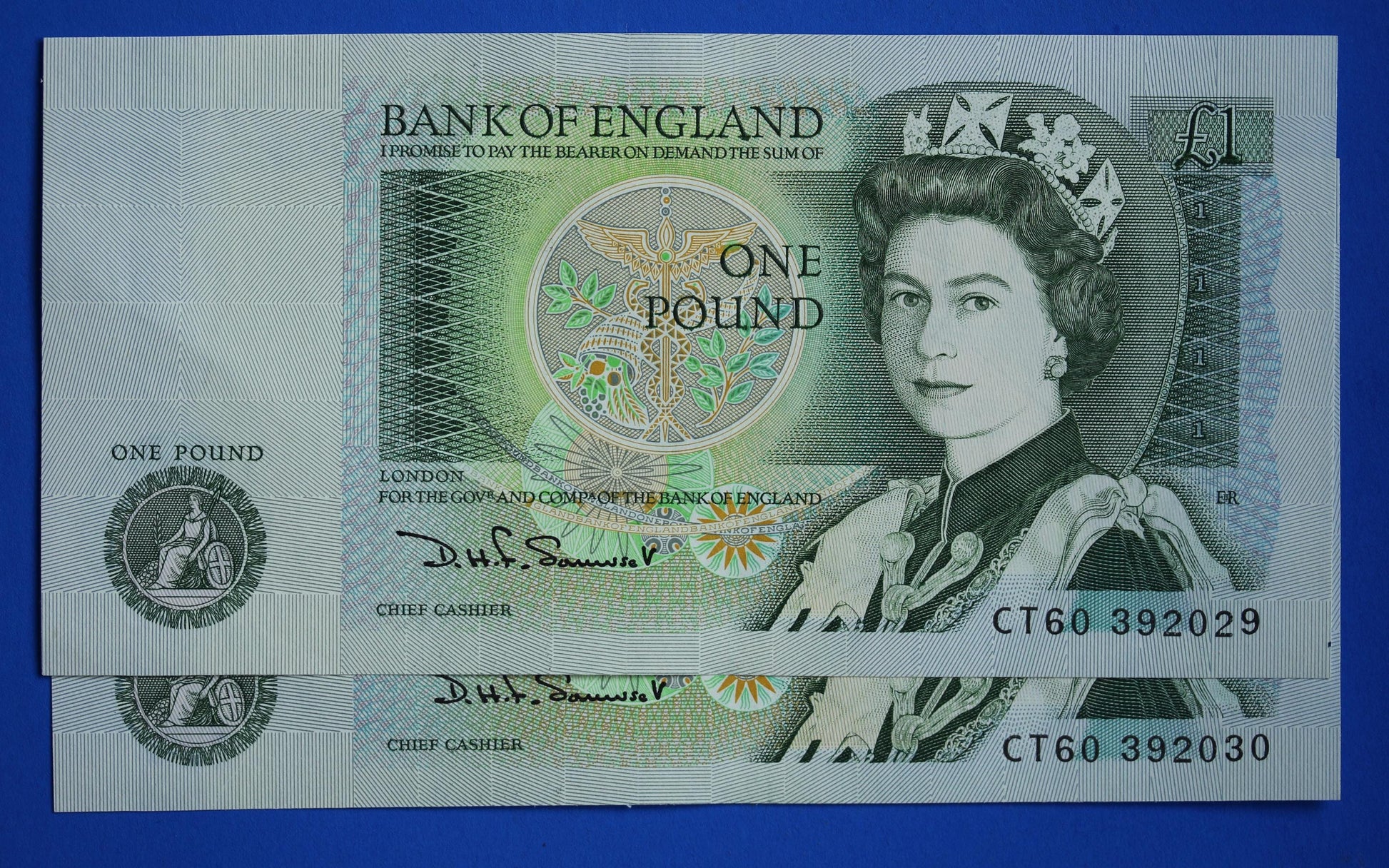 2x 1981 Bank of England One pound 1 pound Somerset Prefix "CT60" banknotes, Elizabeth II, CONSECUTIVE Numbers [09/25 31913]