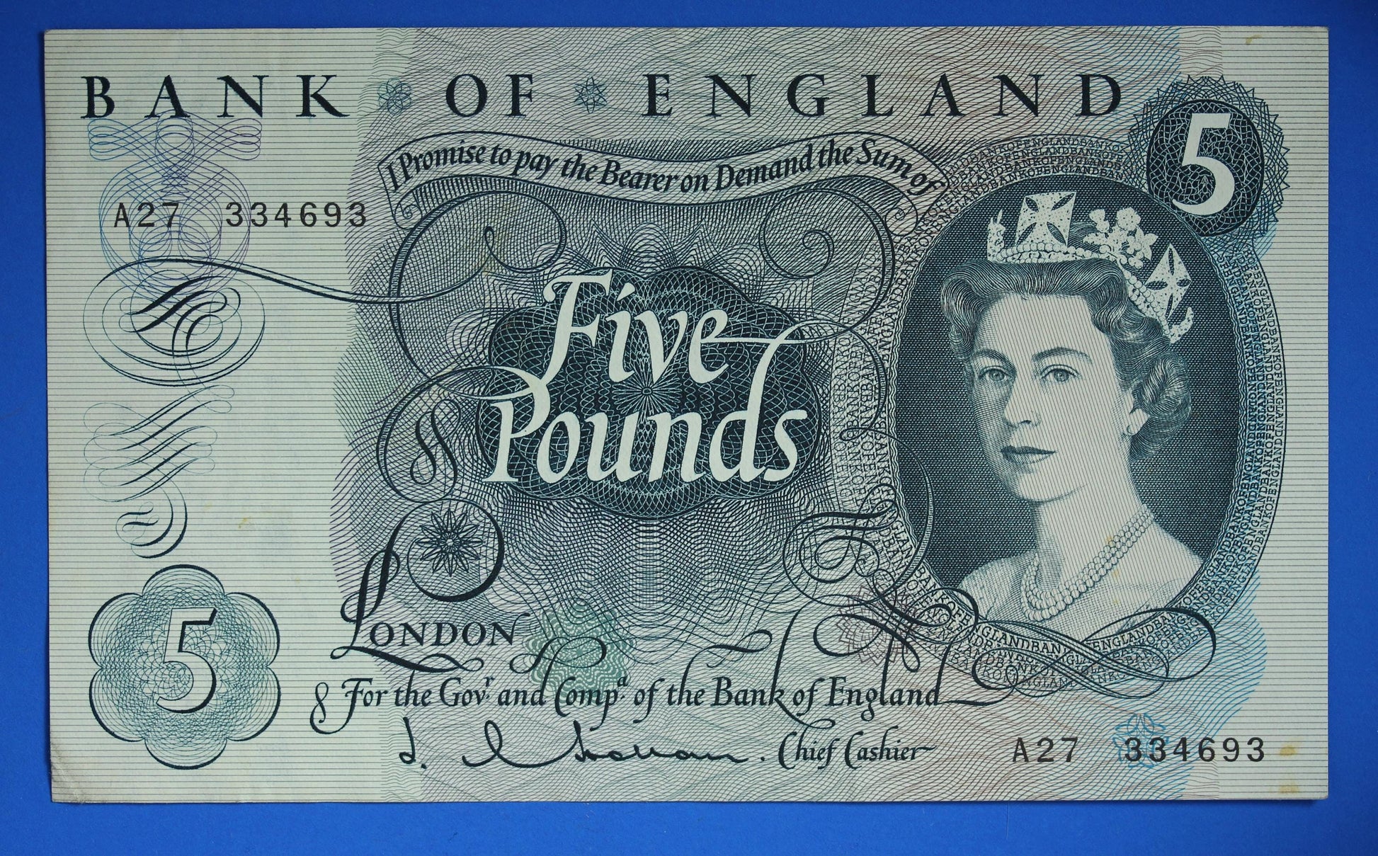 1963 Bank of England Five pound 5 pound, O'Brien "A27" banknote [05/25 32814]