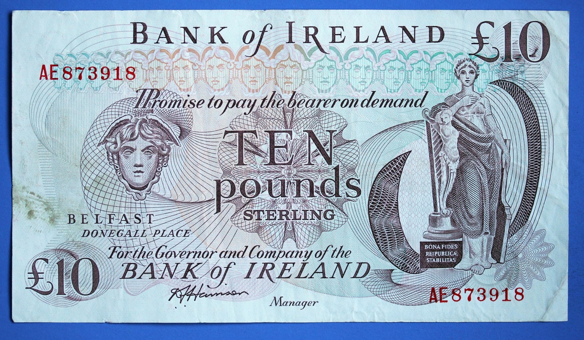 1984 Bank of Ireland Ten Pound Banknote, Northern Ireland, Harrison "AE" [01/26 34126]