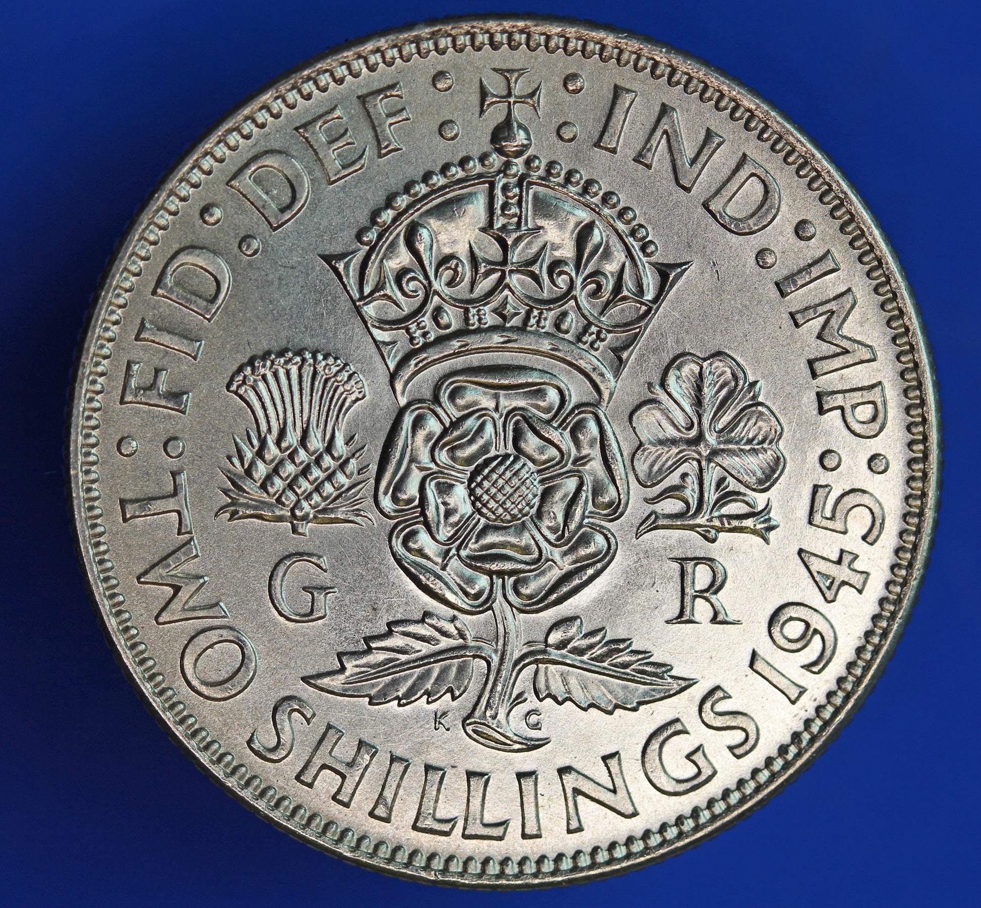 GENUINE British Coin - 1945 George VI florin/ two shillings, 50% silver [02/26 34517]