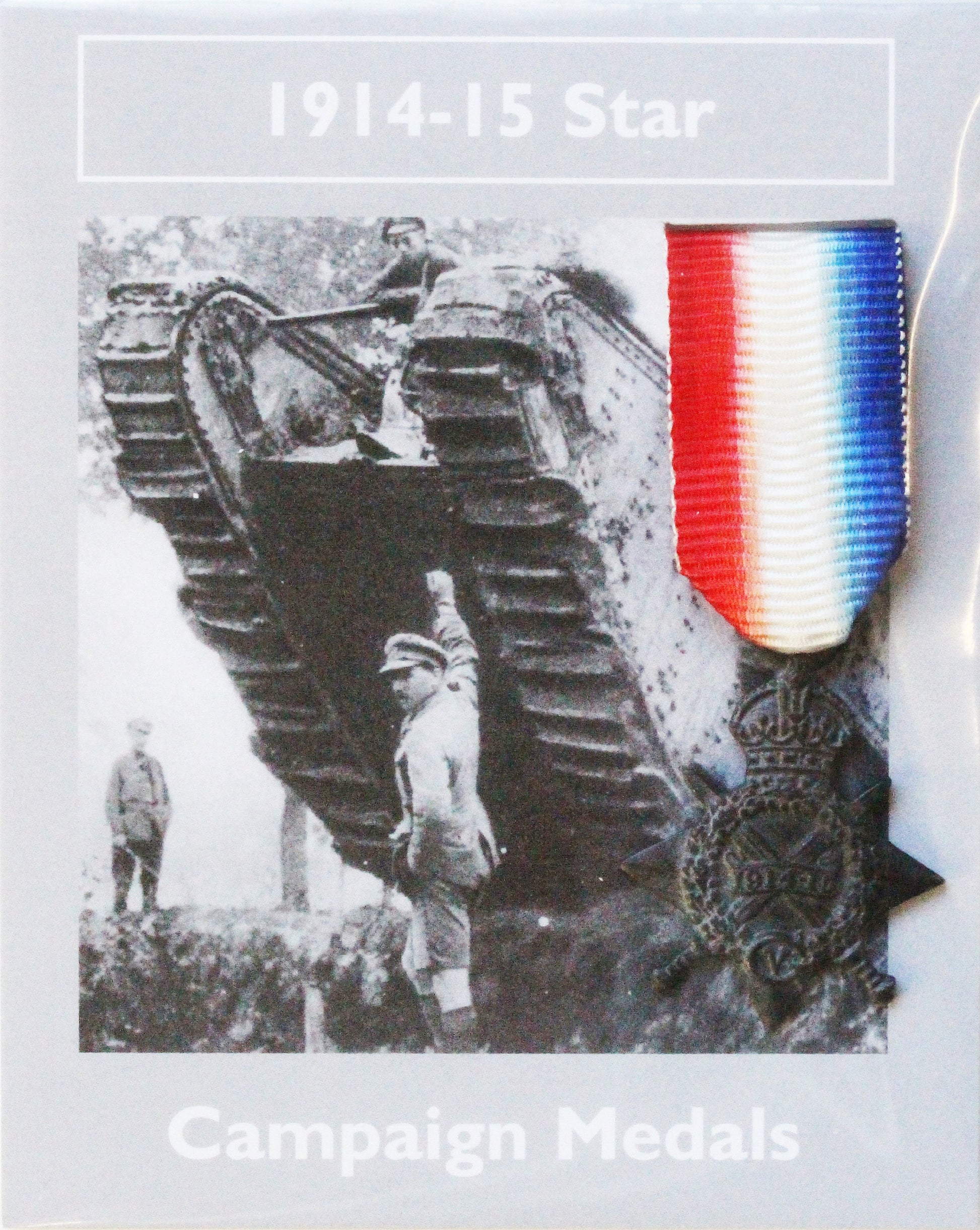 This reproduction 1914-15 Star medal is made from bronzed lead-free pewter. It is supplied on a red, white and blue ribbon attached to a card with an image of a British tank crossing a trench on the front and historical information on the reverse.
