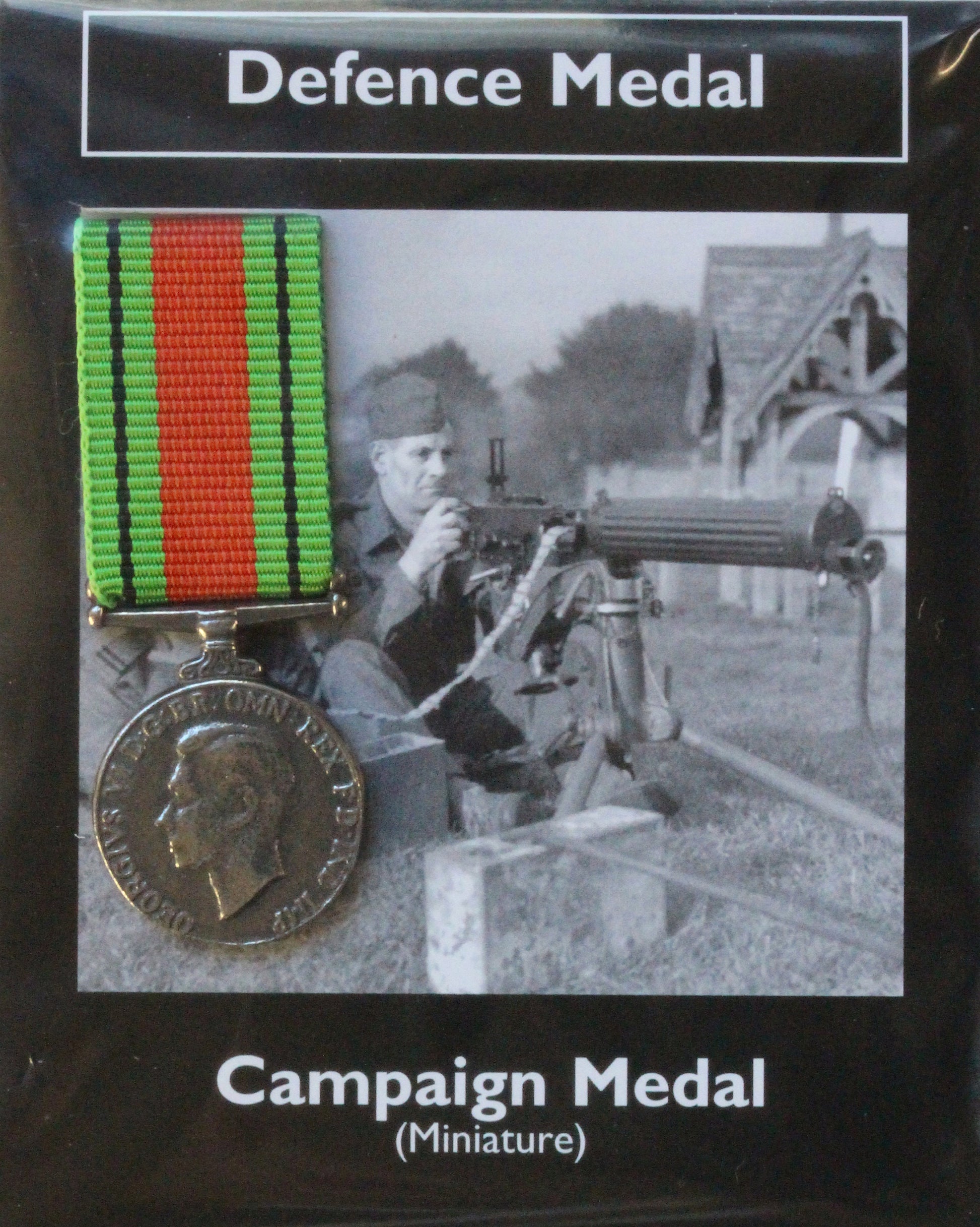 A miniature defence medal supplied with ribbon and mounted on a card. The information on the card describes how and when the medal would be awarded
