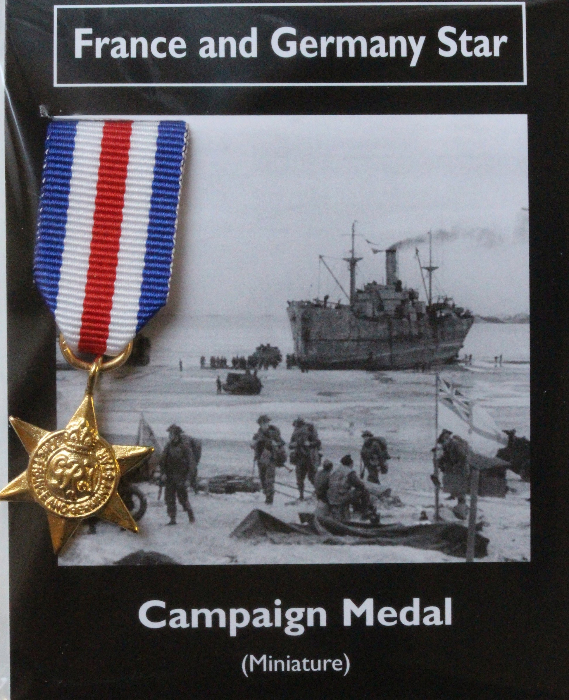 This reproduction France and Germany Star medal is made from 22ct gold plated lead-free pewter. It is supplied on a red, blue and white ribbon attached to a card with an image of troops moving inland from their landing craft on the front and historical information on the reverse.