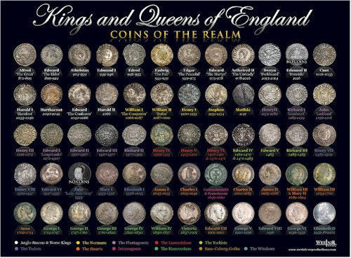 This history of the Kings and Queen of England are shown in the amazing coinage each ruler produced during their reign. Each coin image shows the obverse of the coin with a depiction of the ruler on it.
