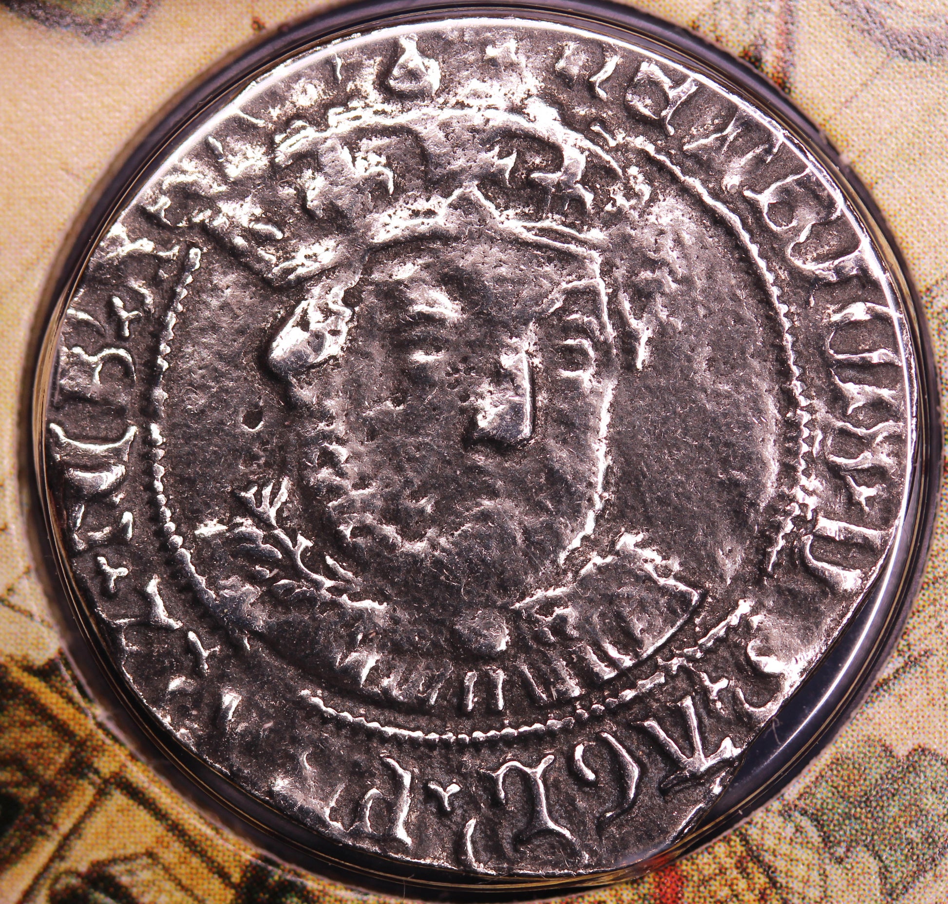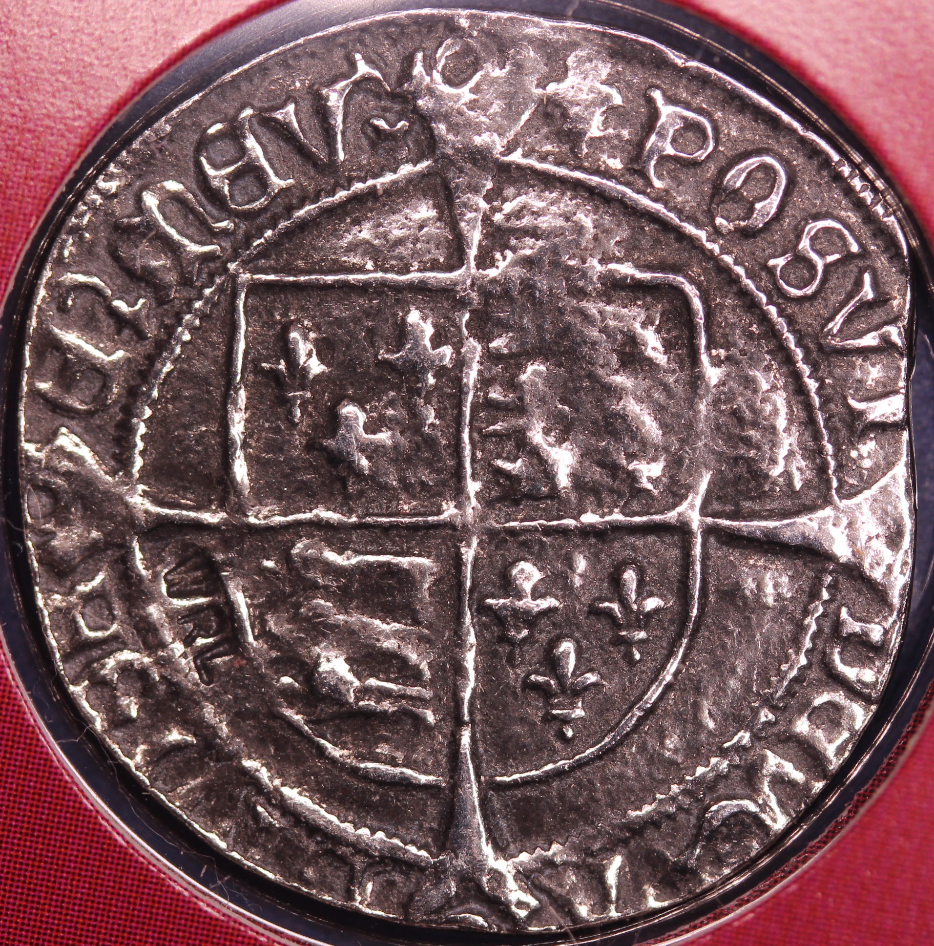 The reproduction Henry VIII groat shows a bust of Henry on the obverse and the royal shield of arms on the reverse.