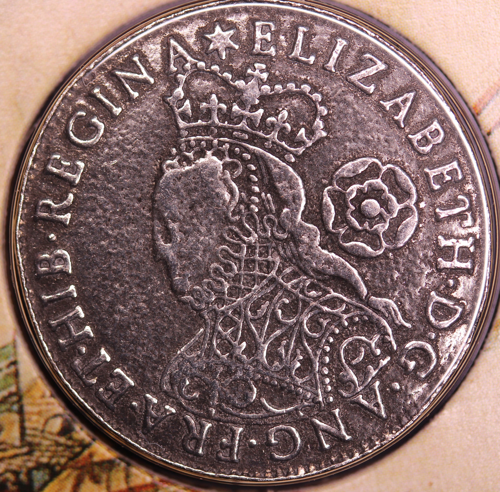The Elizabeth I Sixpence shows the bust of Elizabeth on the obverse and the royal shield of arms on the reverse.
