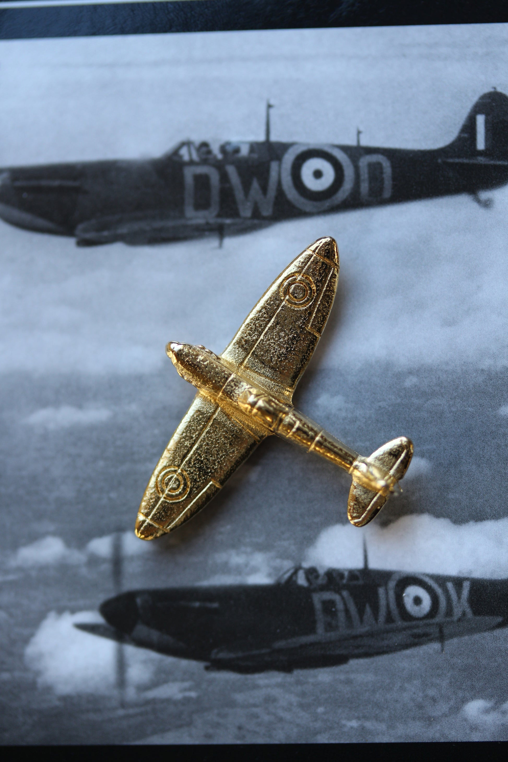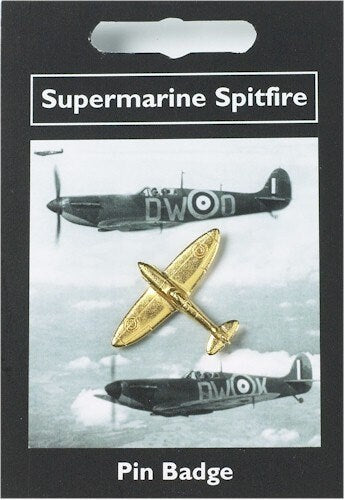 Gold plated pewter Spitfire supplied on a pin with clasp. The information on the reverse of the card describes the Spitfire and when it was used.