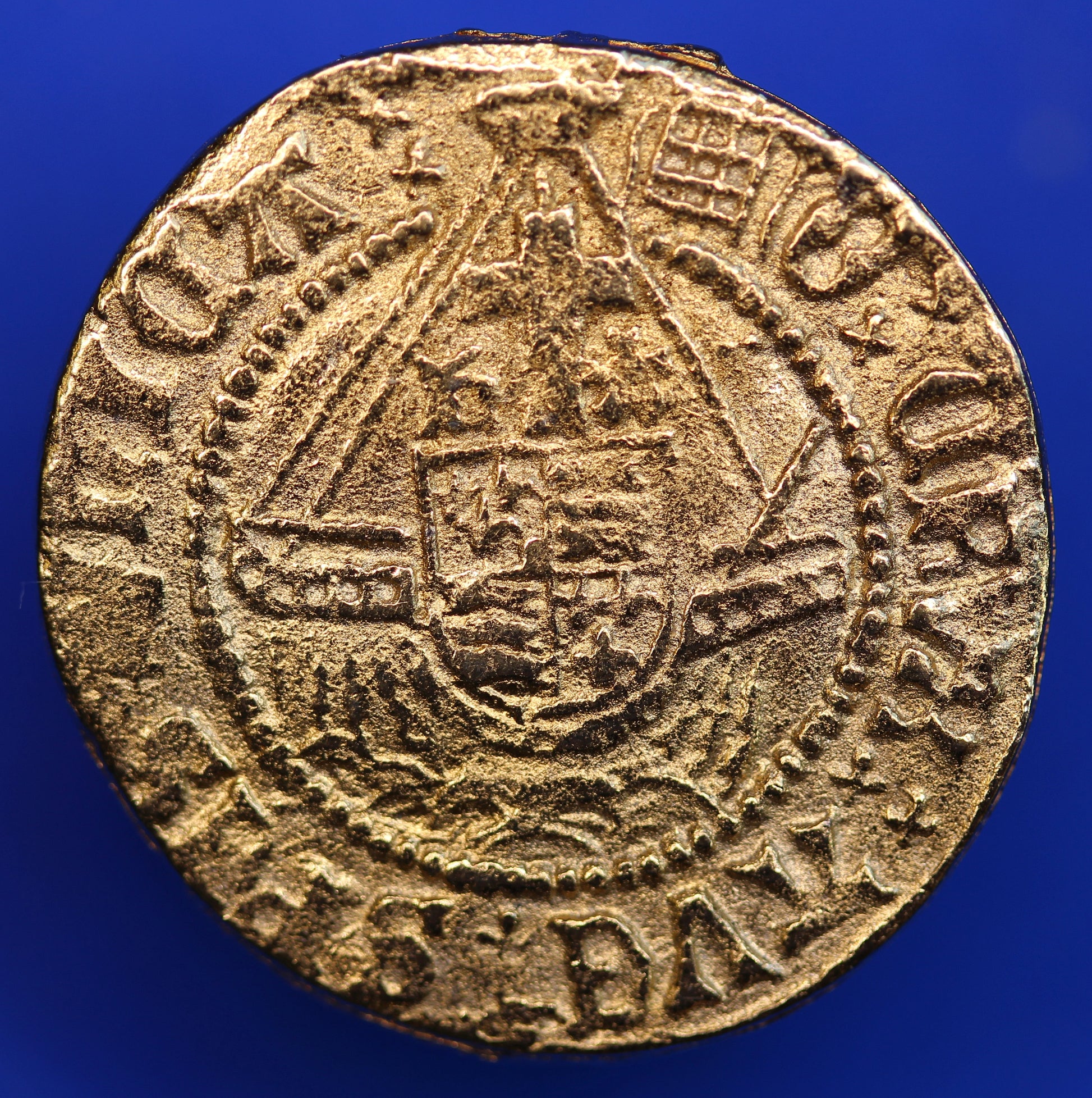 A reproduction Henry VIII Half-Angel coin with St. Michael with a dragon on the obverse and a ship bearing a shield on the reverse.