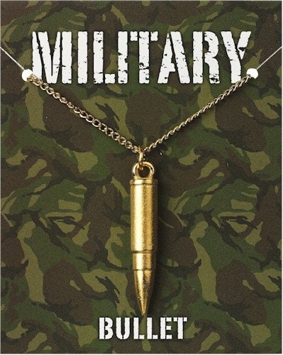 Gold plated pewter bullet supplied on a gold chain. The information on the reverse of the card describes how different equipment is used depending on the type of theatre of war.