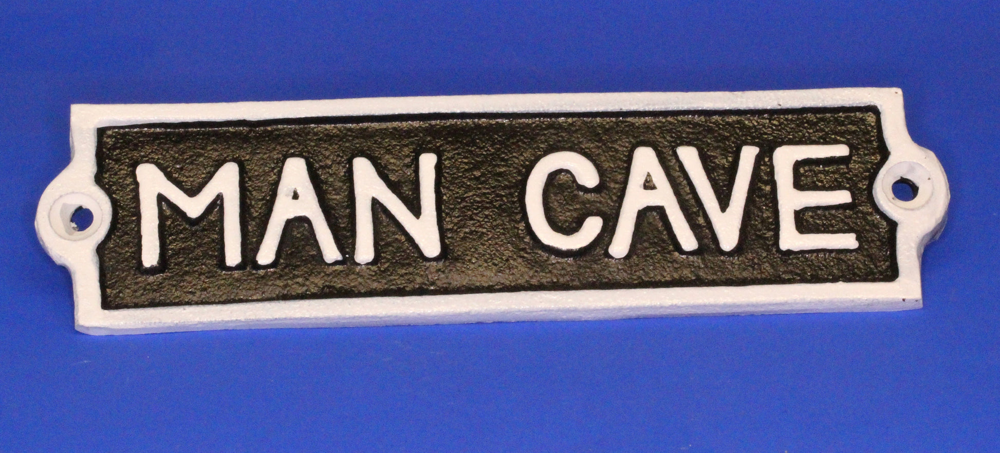 This cast iron sign bears the words "Man Cave". Handpainted in black with raised white border and lettering, this sign is perfect to place outside any room where manly activities are taking place! The sign is finised in a vintage style, and comes with two predrilled holes for easy hanging on a wall or door of your choice.