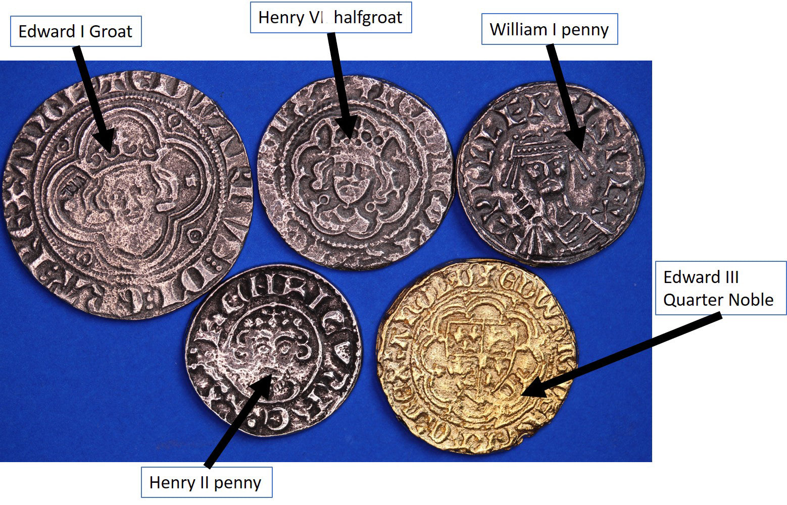 REPRODUCTION Medieval coins 5 Medieval coins, William 1, Edward 1 and 111, Henry II and VI, 18-25mm [5MED]