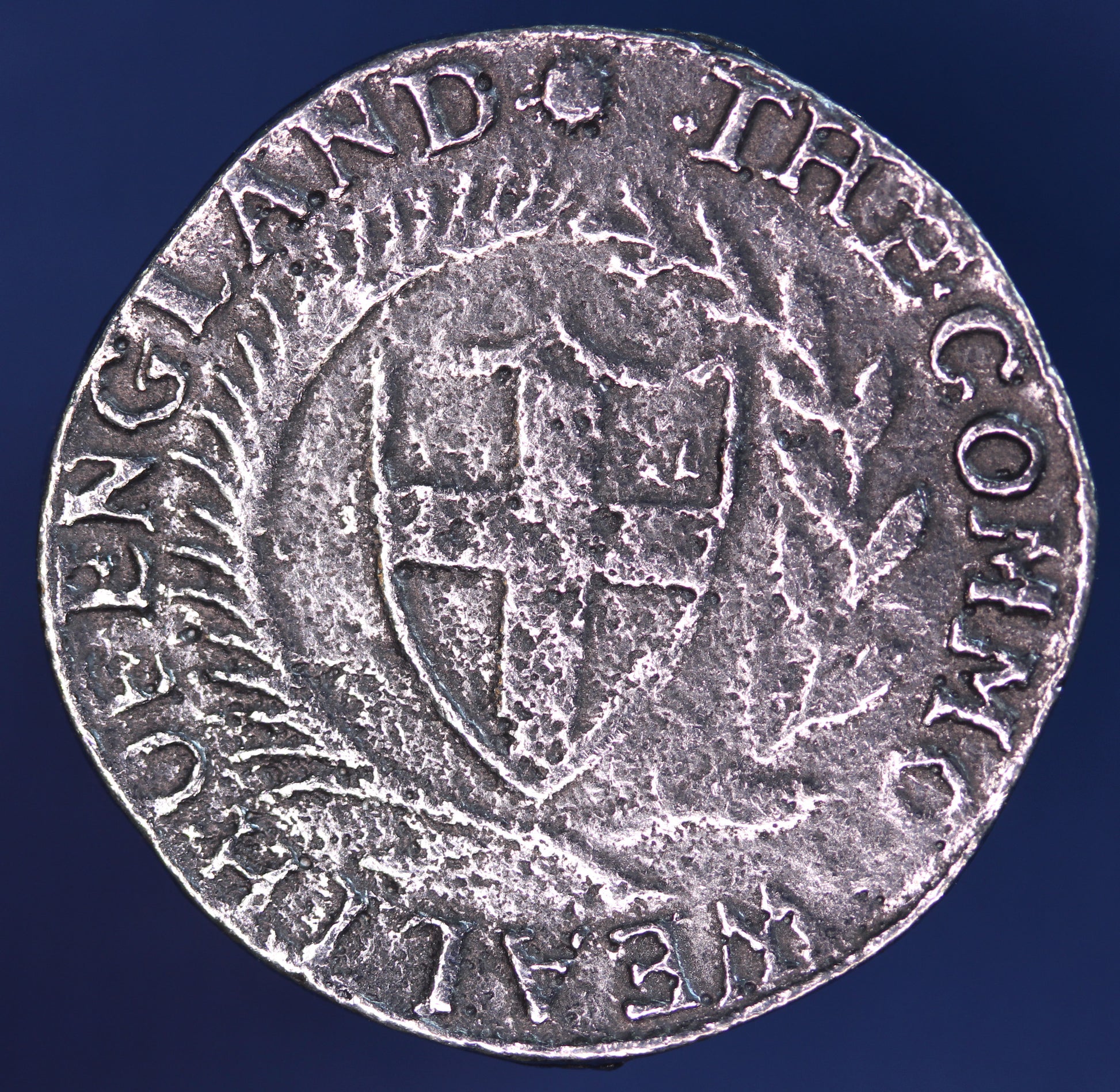 A reproduction Shilling coin of the Commonwealth with St. Georges Cross on the obverse and St. Georges Cross with Irish Harp on the reverse.