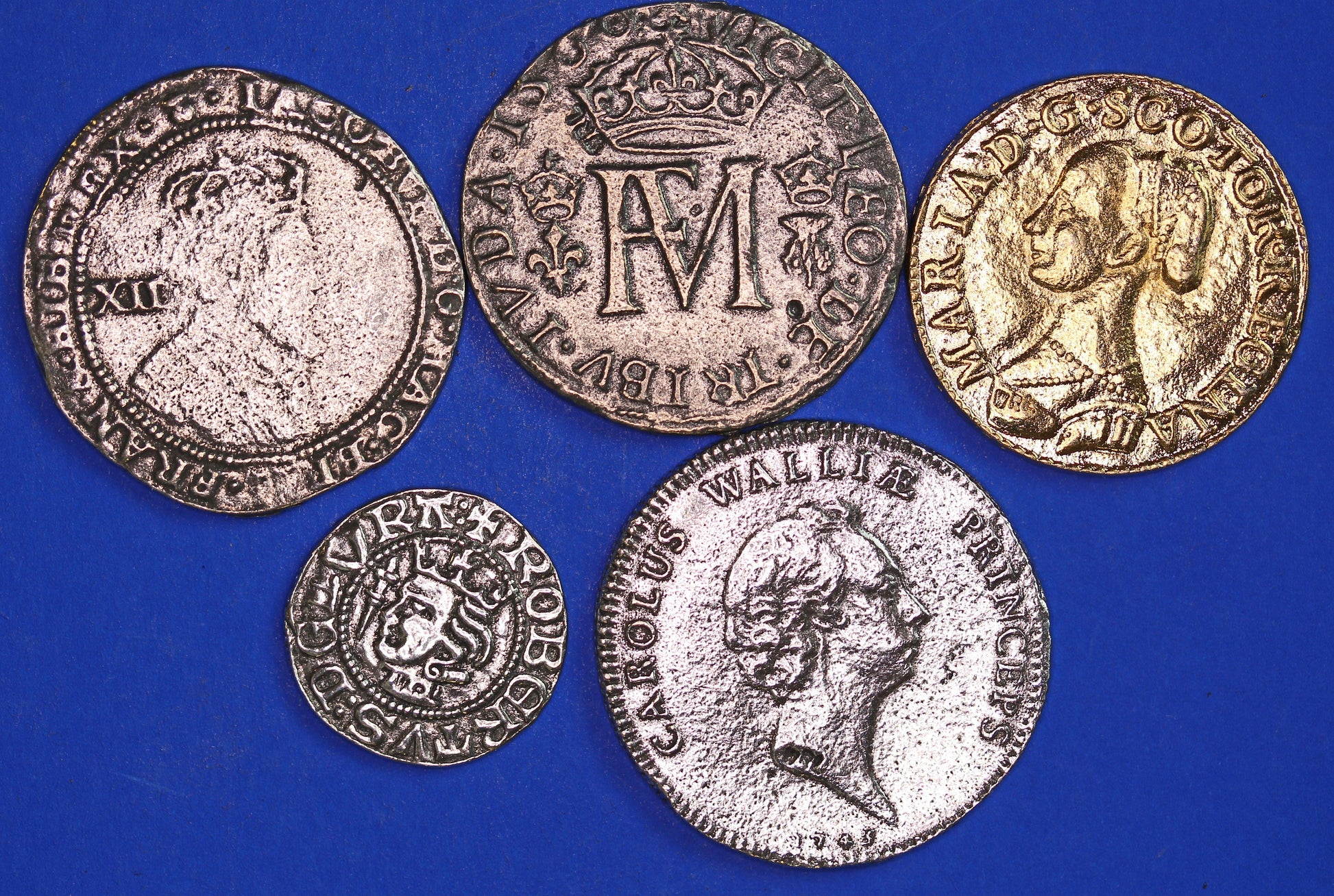 REPRODUCTION Scotland, Scottish Coins and medal, Mary Queen of Scots, James VI, Robert the Bruce silver, Prince Charles Medal [SCOT5]