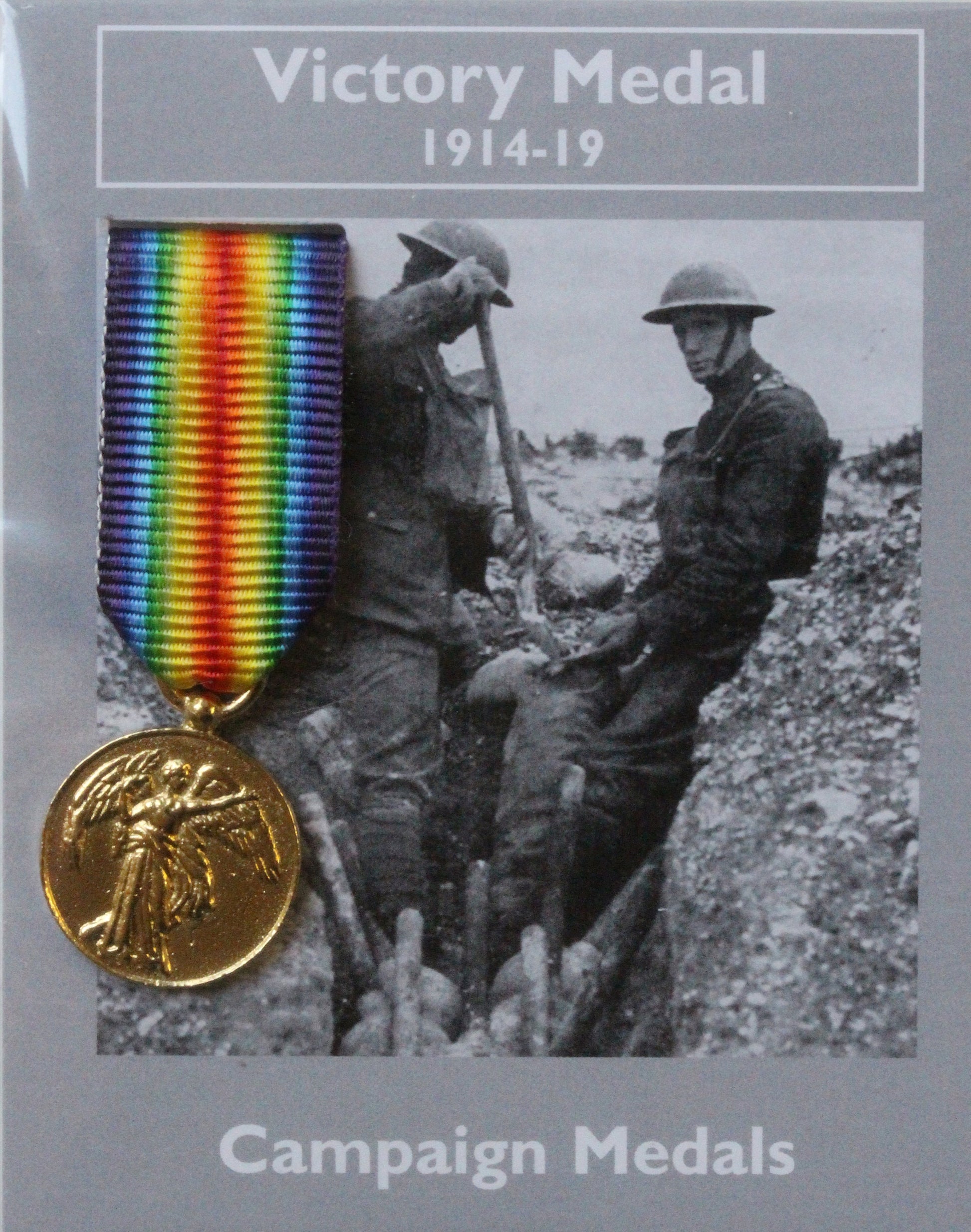 This reproduction Victory medal is made from 22ct gold plated lead-free pewter. It is supplied on a rainbow coloured ribbon attached to a card with an image of troops surrounded by motar bombs on the front and historical information on the reverse.