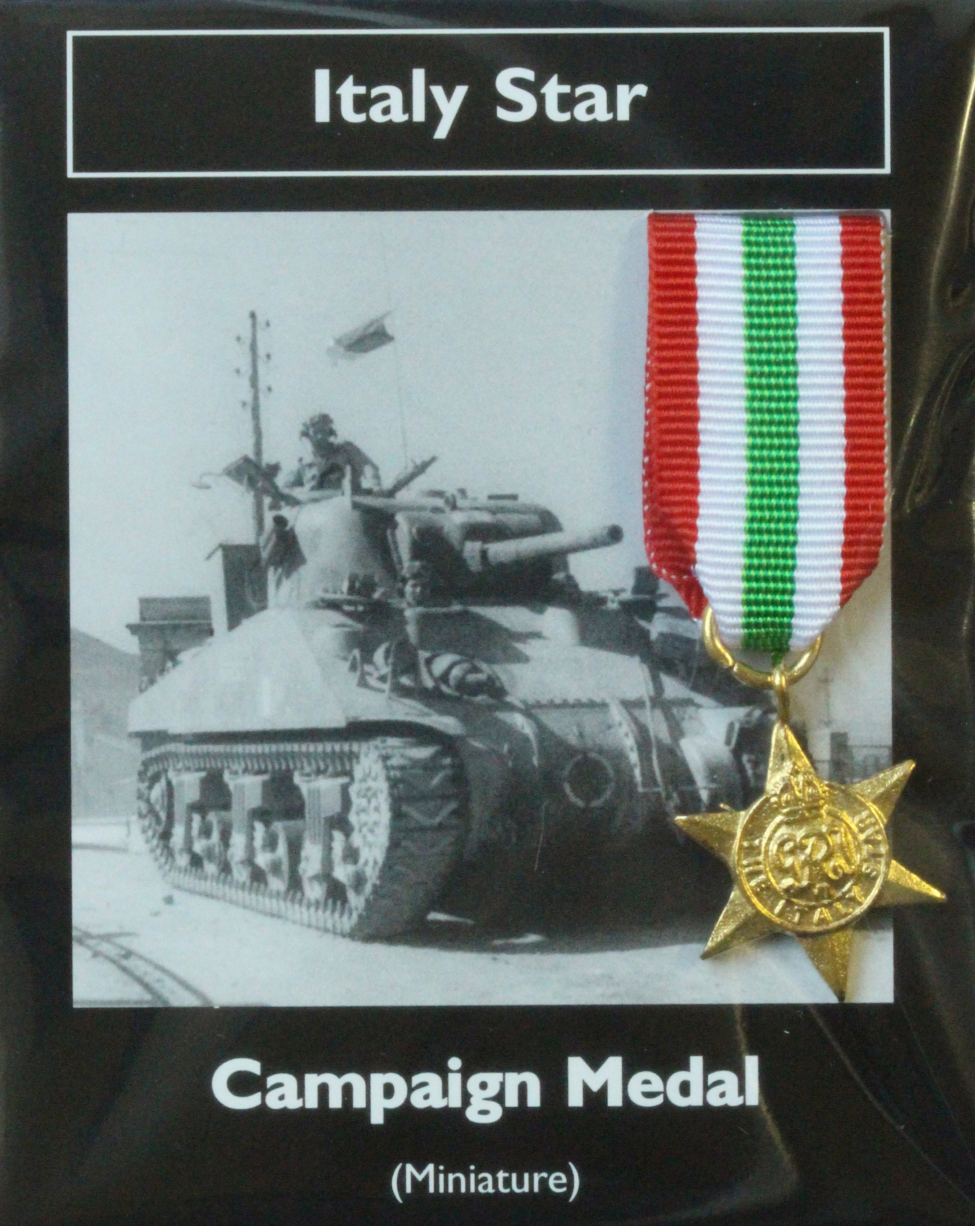 This reproduction Italy Star medal is made from 22ct gold plated lead-free pewter. It is supplied on a red, green and white ribbon attached to a card with an image of a tank on the front and historical information on the reverse.