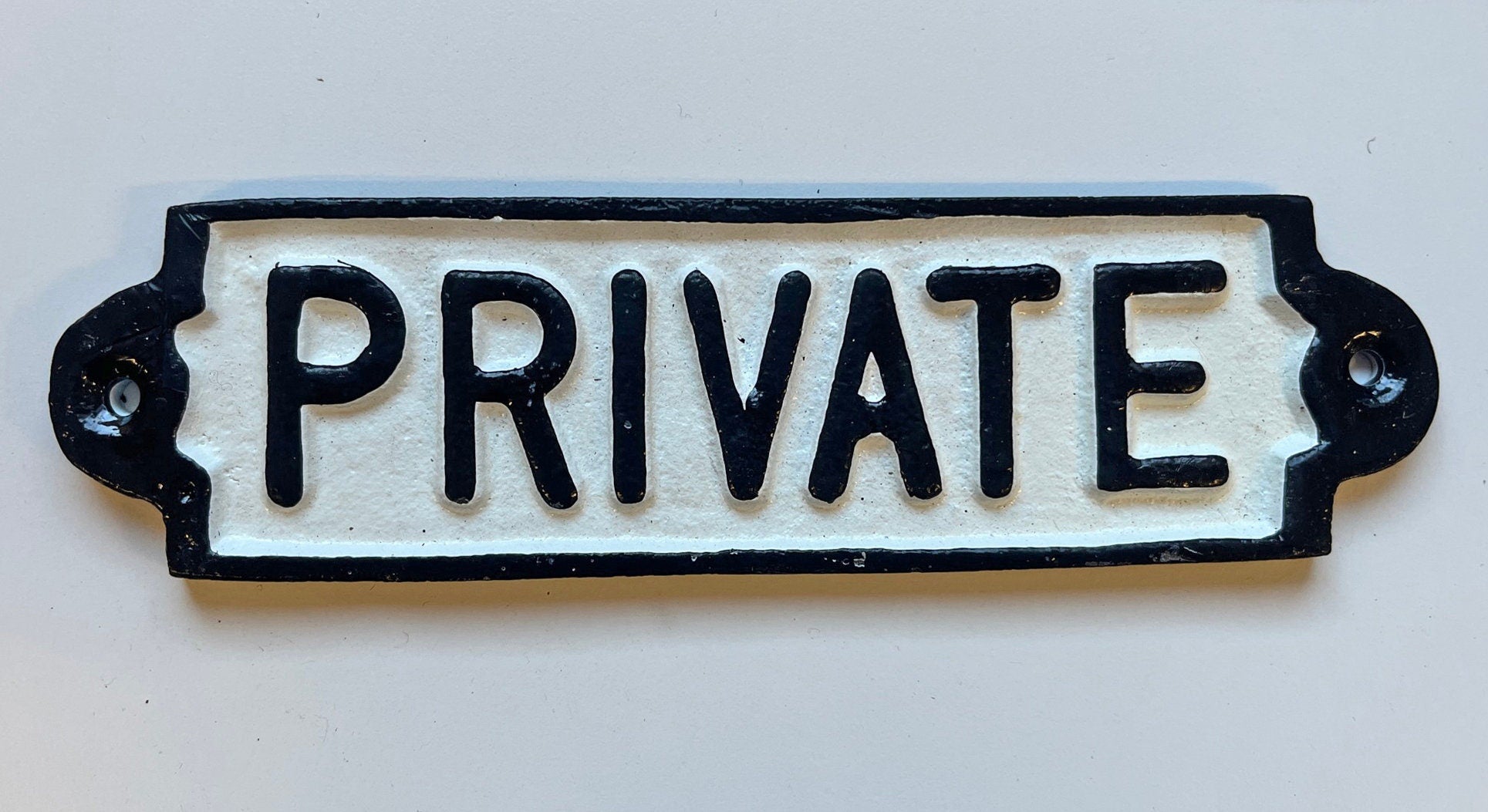 This "PRIVATE" sign is made from cast iron in the traditional, vintage style. Rectangular in shape and finished in handpainted white with raised black lettering, this plaque would be at home in a country pub, restaurant, bed & breakfast, cafe, or other public place. The cast iron is pre-drilled with hanging holes, so it will be easy to mount on a wall, door or window.